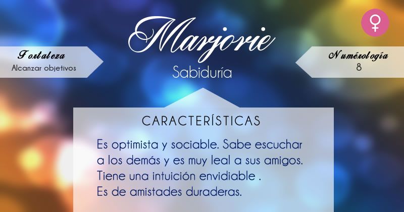 Ahora que sabes el significado del nombre marjorie necesitas saber la personalidad las caracteristicas del nombre el color de la suerte y el numero de la suerte. Realizar en cierto modo un papel de guía espiritual. No dudes en consultar los comentarios de otras personas o compartir los suyos con nosotros aquí si tienes más información acerca de este nombre.